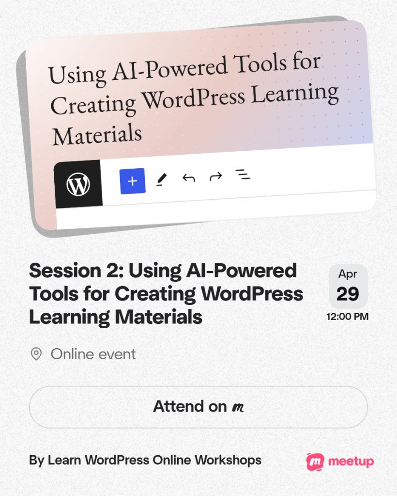 today I attended the WordPress Online Workshop, “Session 2: Using AI-Powered Tools for Creating WordPress Learning Materials.”